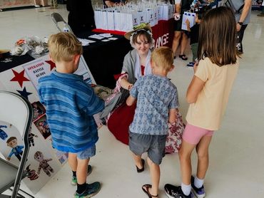 The program showed the children the deployment process by having them register for deployment, receive their camouflage dog tags, go through a debriefing, get all their medical “shots and medications,” and learn how to wrap a wound. Then, they walked through and learned about various weaponry and military jobs—such as the bomb squad and a military dog doing demonstrations.